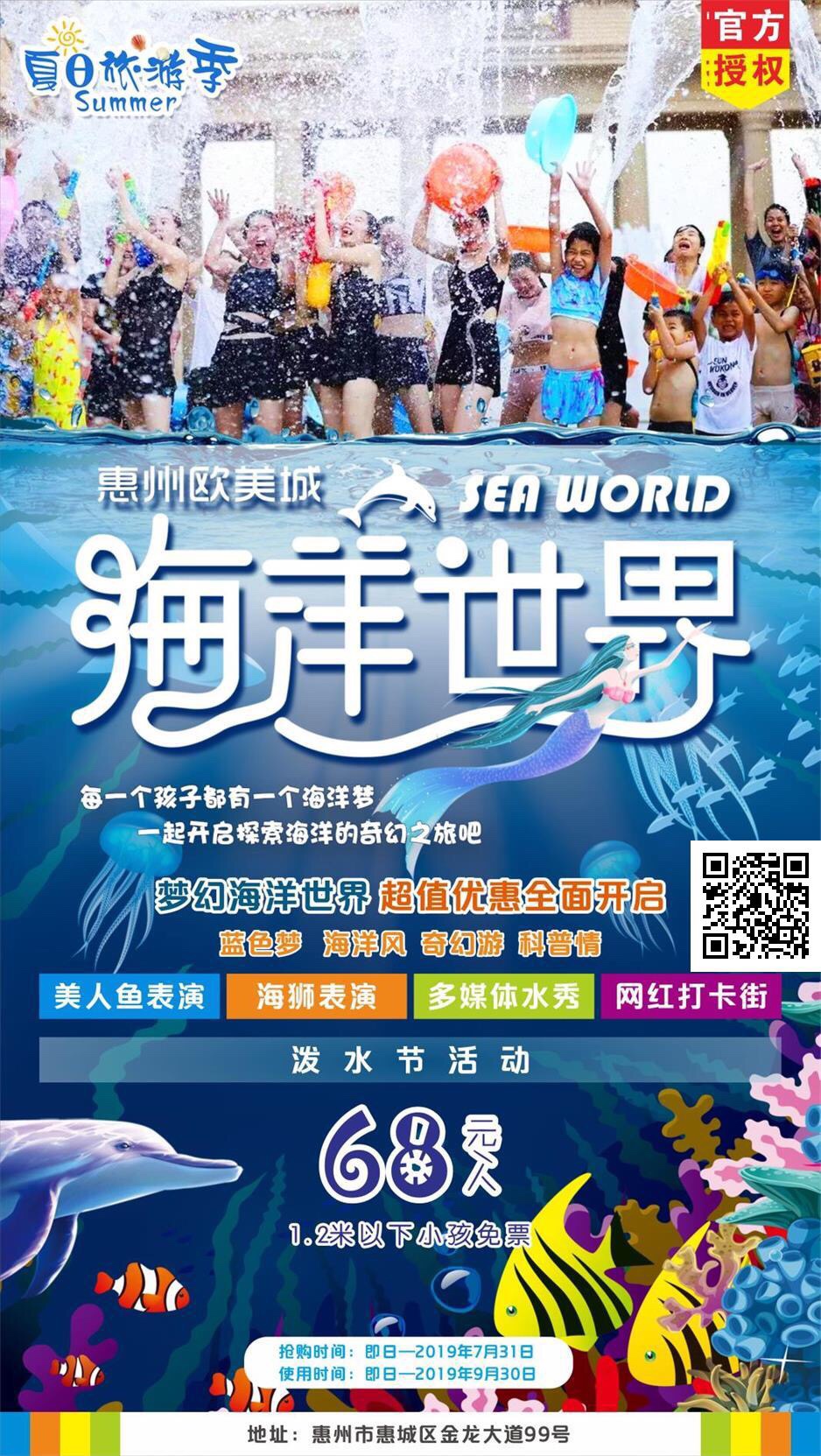 【第三波】68元超值价抢购欧美城海洋世界门票!景区大门票+海洋世界门票+美人鱼表演+海狮表演+多媒体水秀+泼水节活动~探秘海洋大世界,还不赶快约起~点击长按图片里的二维码识别下单购买即可!咨询热线15217849138(微信同步)