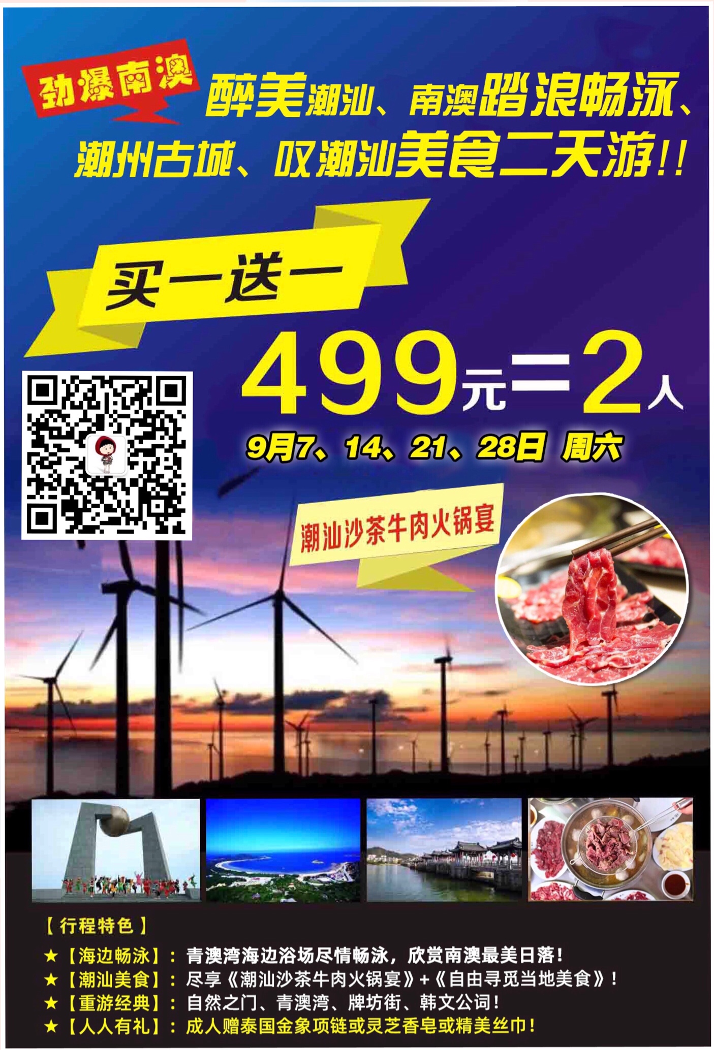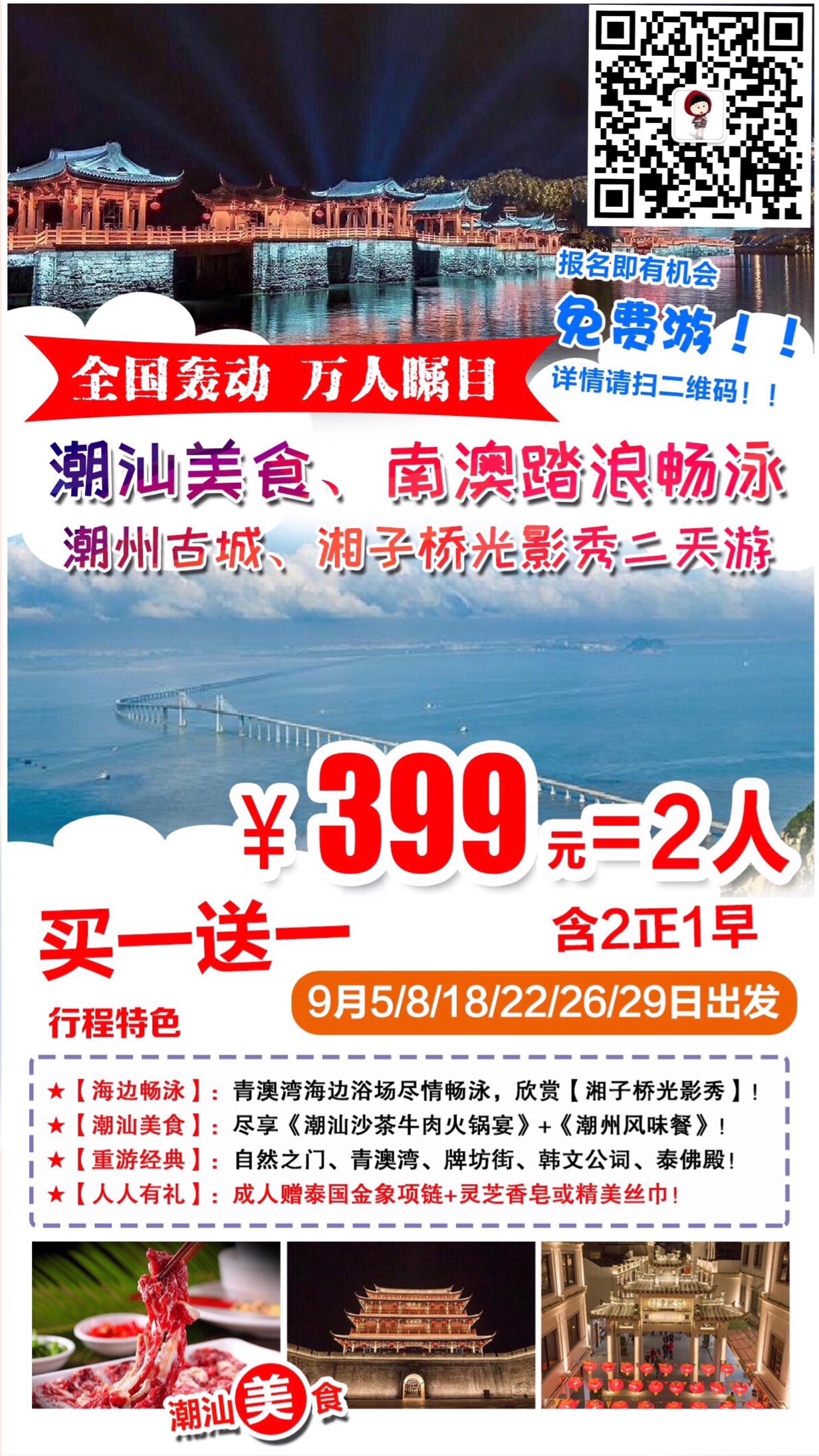 9月5日潮汕二天游399元=2人(买一送一)9月7日出发醉美潮汕二天游499元=2人(买一送一)报名热线惠州青年国际旅行社园洲门市部15217849138(微信同步)