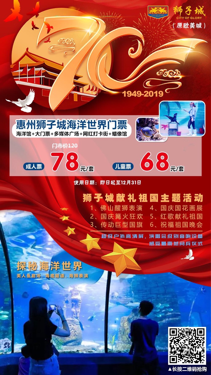 国庆专场!惠州狮子城(原欧美城)78元成人票!68元儿童票!一票玩遍6大项目!景区大门票+海洋世界+美人鱼表演+海狮表演+多媒体水秀+网红打卡街~点击长按图片里的二维码识别下单购买即可咨询热线15217849138(微信同步)