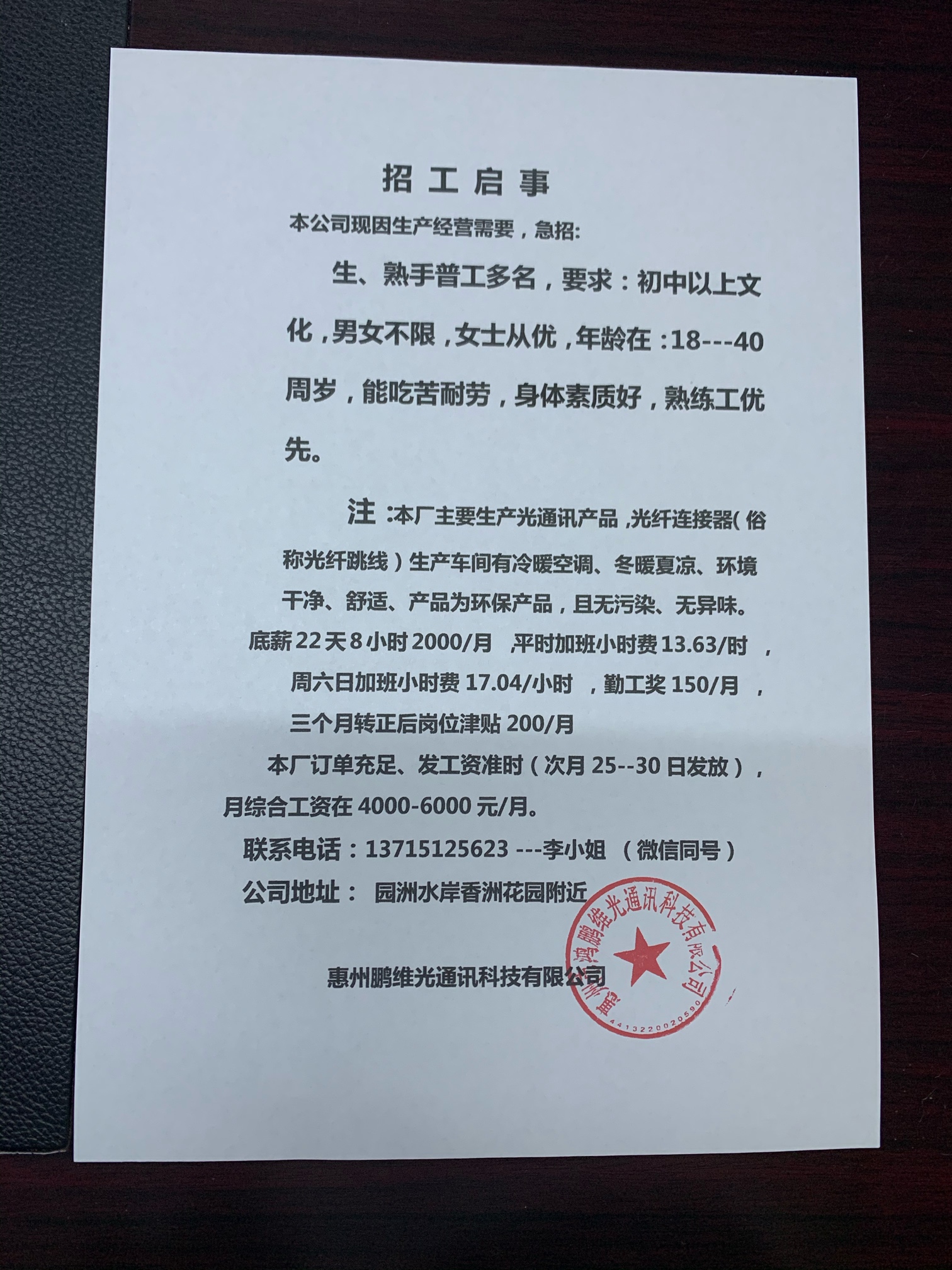 招聘男女普工
