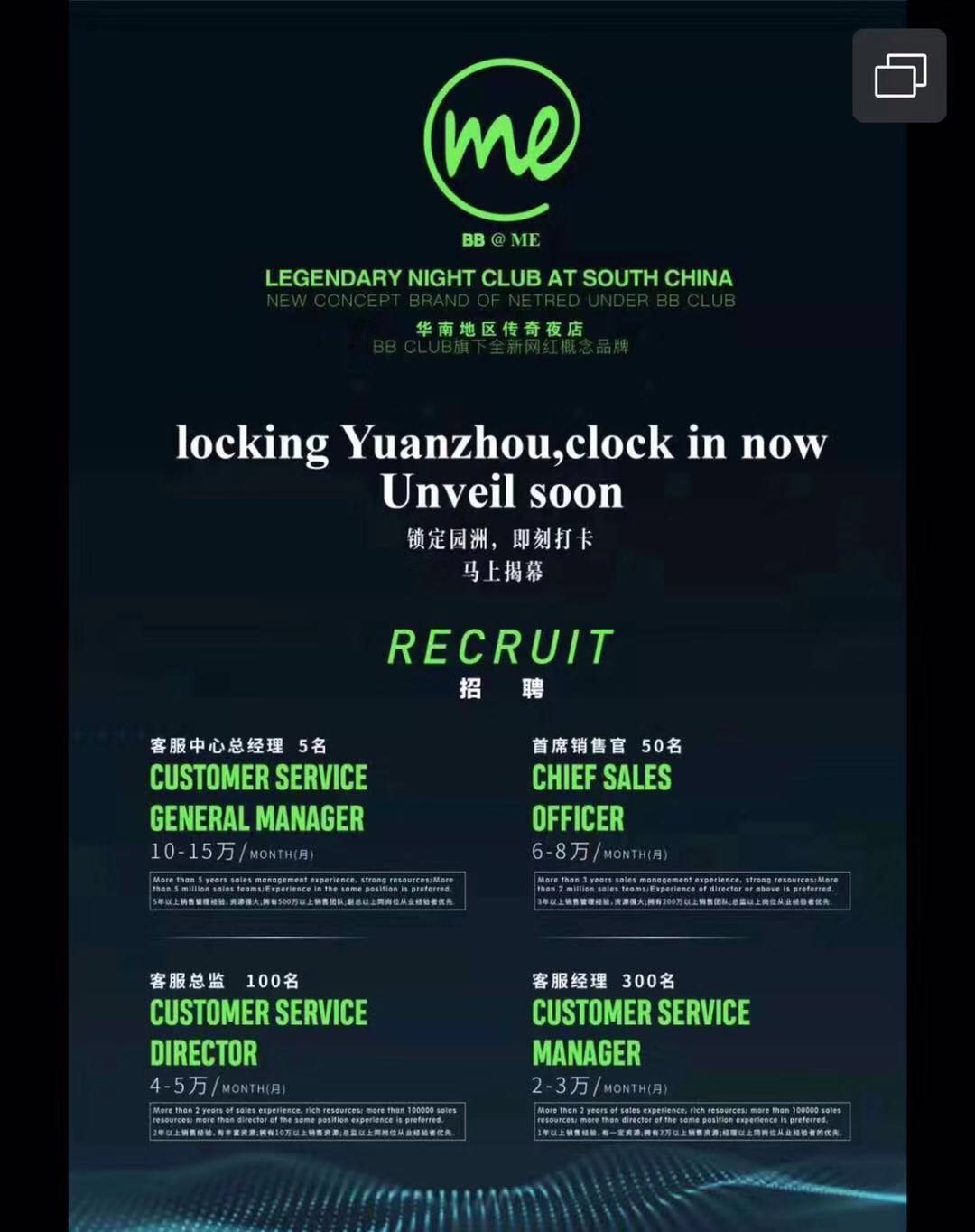 园洲BB@ME酒吧招聘数名营销,有意者联系15119231314叶总监也可以加微信详问