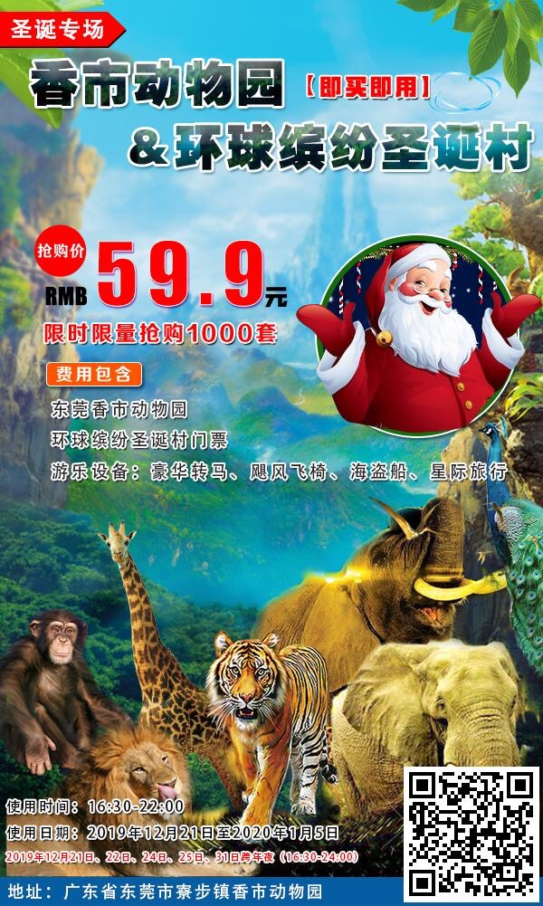 东莞·香市动物园3折抢·59.9元与国宝熊猫一起嗨~2019环球缤纷圣诞浪漫打卡,飘雪森林+冰雪森林+璀璨烟火秀+珍惜动物零距离等12大主题点击长按图片里的二维码识别下单购买吧