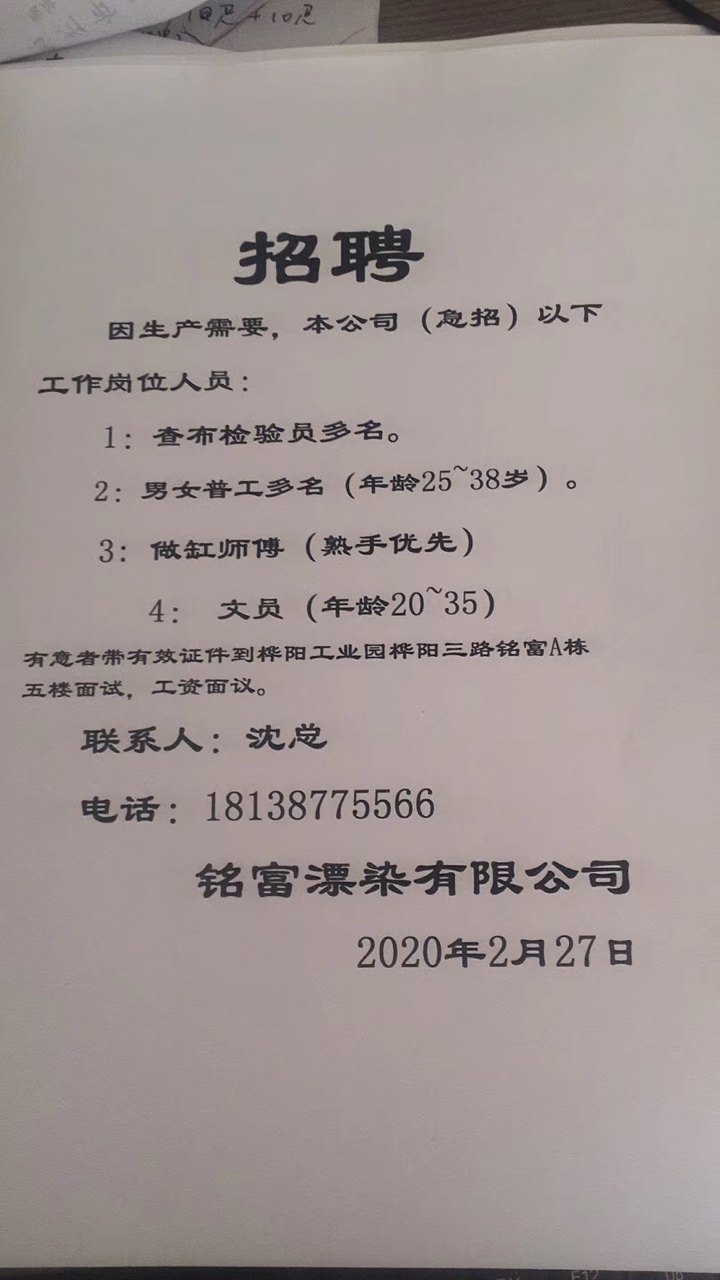 桦阳工业园三路铭富漂染有限公司,有无经验都可报名,联系微信18138775613
