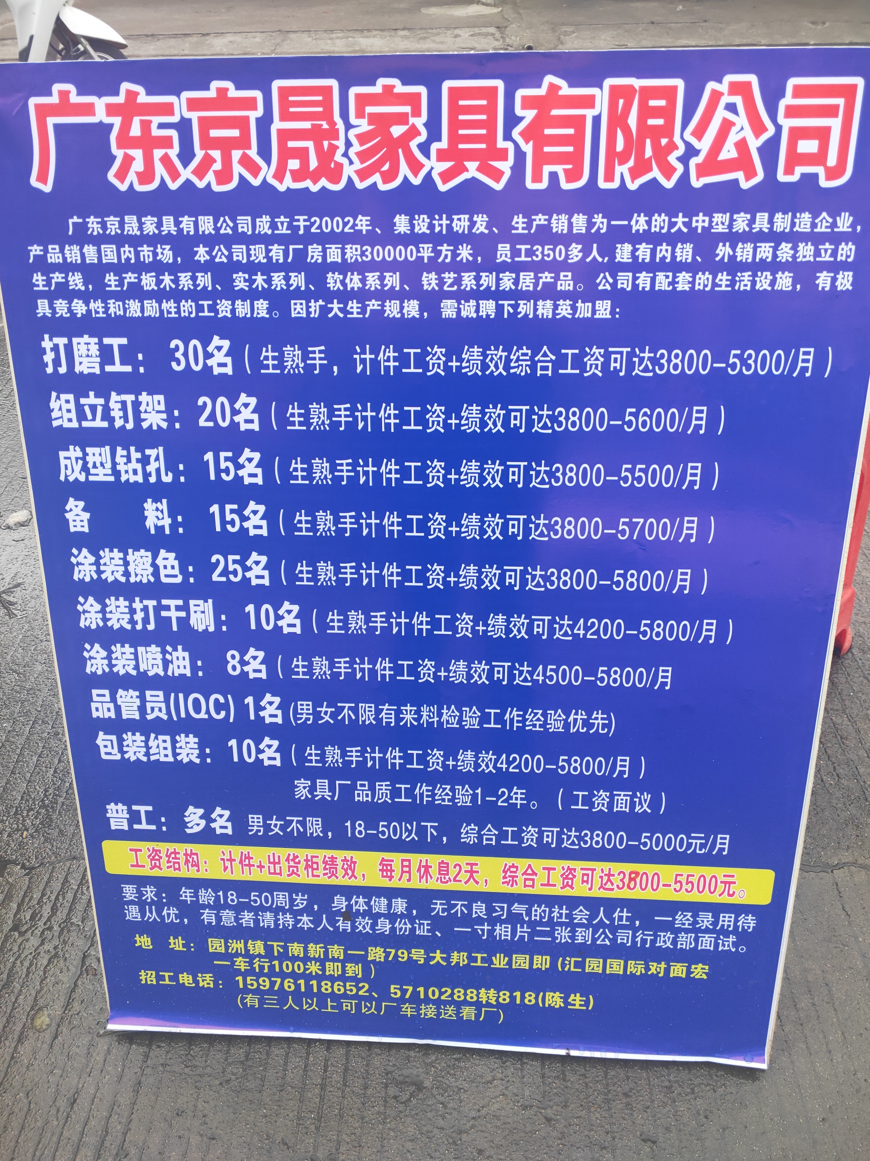 招聘品管一名,男女不限,有经验者优先!包吃住,工资待遇面议,有意者联系,地址园洲镇下南新南一路79号,汇园国际对面,广东京晟家具有限公司