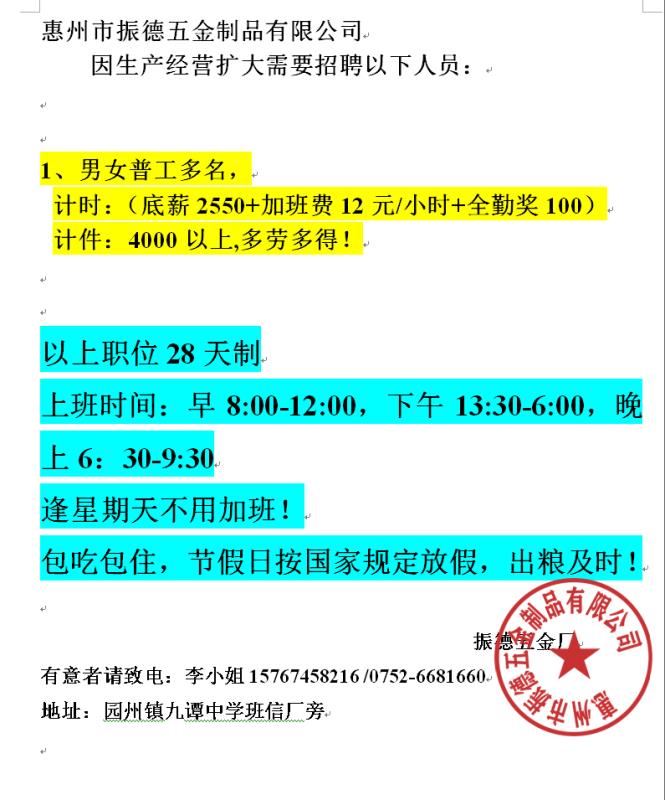 振德五金厂招聘多名普工