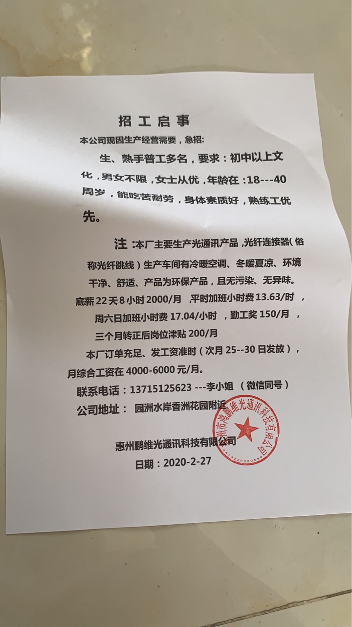 大量招聘男女普工