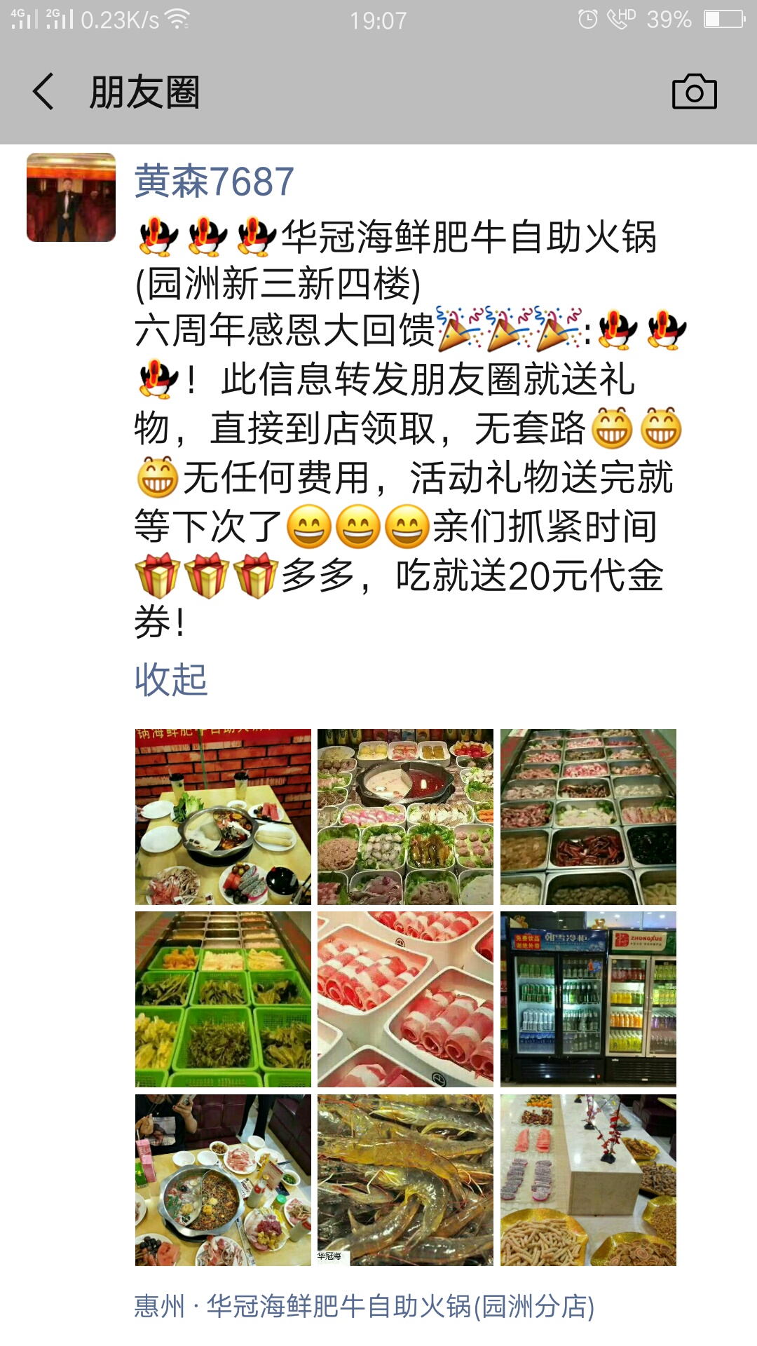 园洲新三新四楼华冠海鲜肥牛自助火锅,海鲜,肥牛,肥羊,水果点心,啤酒饮料近200菜品任吃任喝,午餐/35一位,晚餐/45一位。星期天和节假日午餐晚餐/45一位。烤肉/55一位全包。复制转发本消息到朋友圈可以到店免费领取礼物一份!