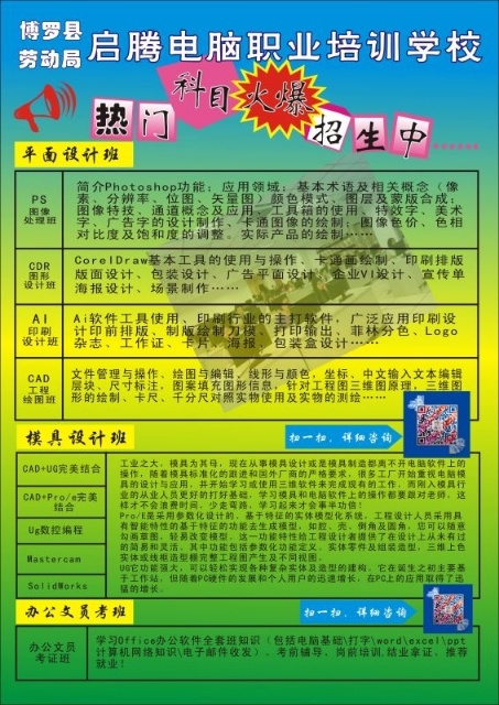 常年开设:电脑培训、办公文秘、平面广告设计,淘宝电商、CAD绘图、产品设计、模具设计、Pro/e产品设计、UG产品设计编程、电工考证,焊工考证,叉车考证等特种工种上岗证,成人大专本科学历,考证入户!会计考证+税务真帐实操