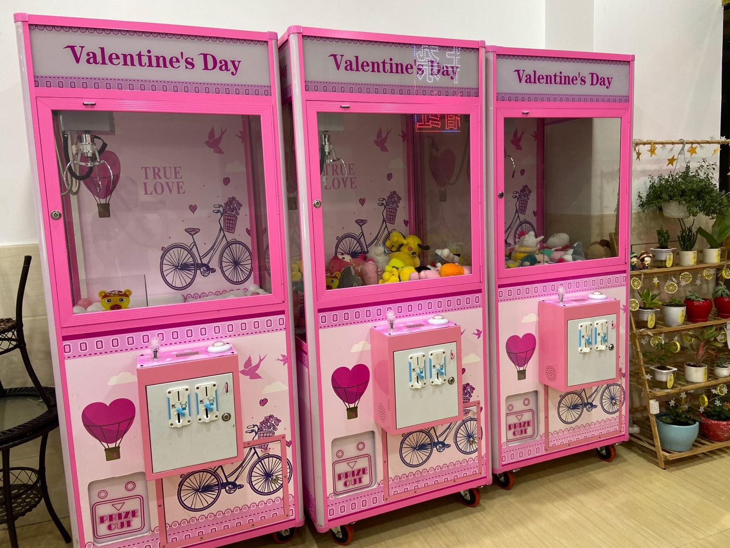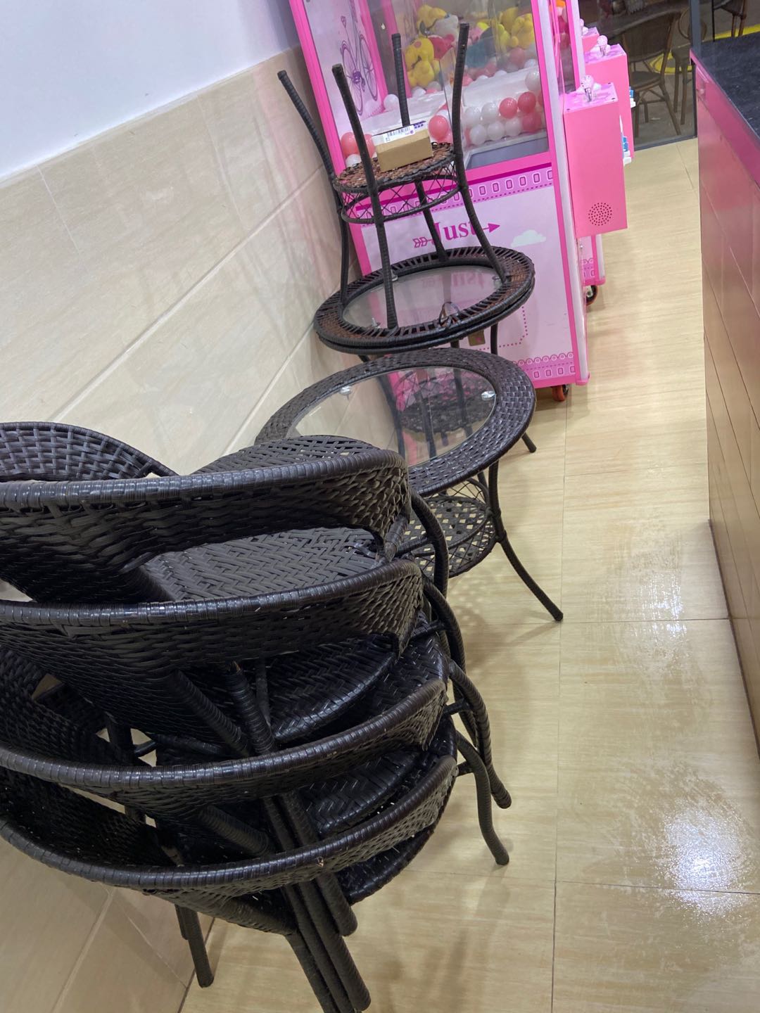 出售娃娃机3台,成色9新,功能正常。 图2桌椅两桌两椅,图3三桌七椅