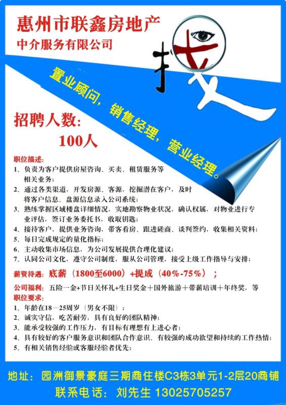 工作地点:惠州市博罗县园洲镇御景豪庭北门联鑫地产