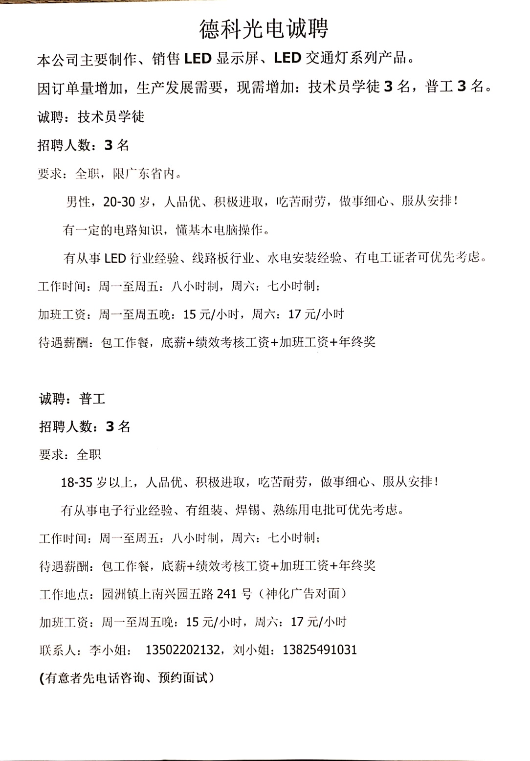 德科光电诚聘:技术员学徒;普工;