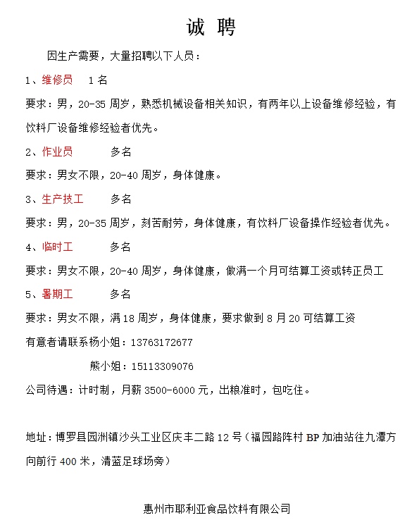 有意者可到厂面试或电话联系