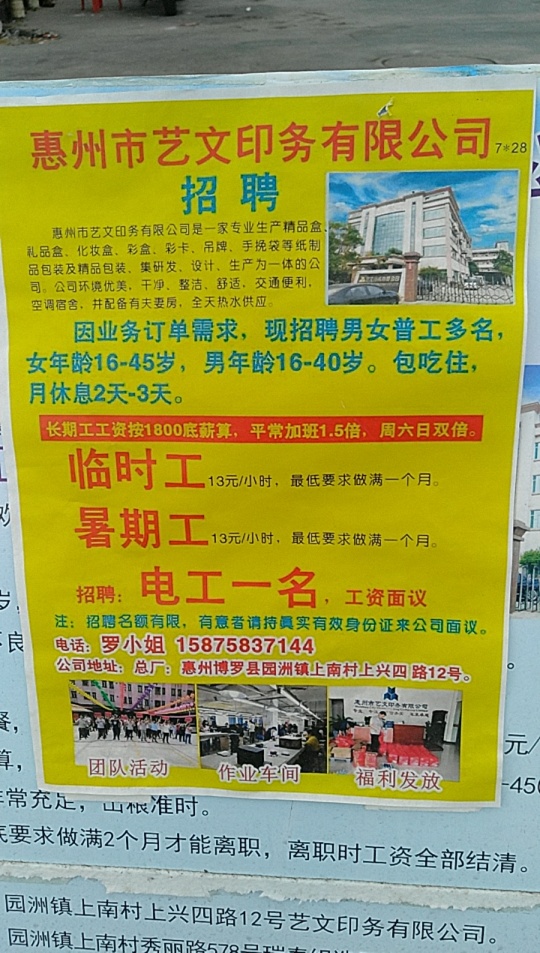 因生产需要,艺文印务有限公司现招聘临时工暑期工多名,至少做满一个月。