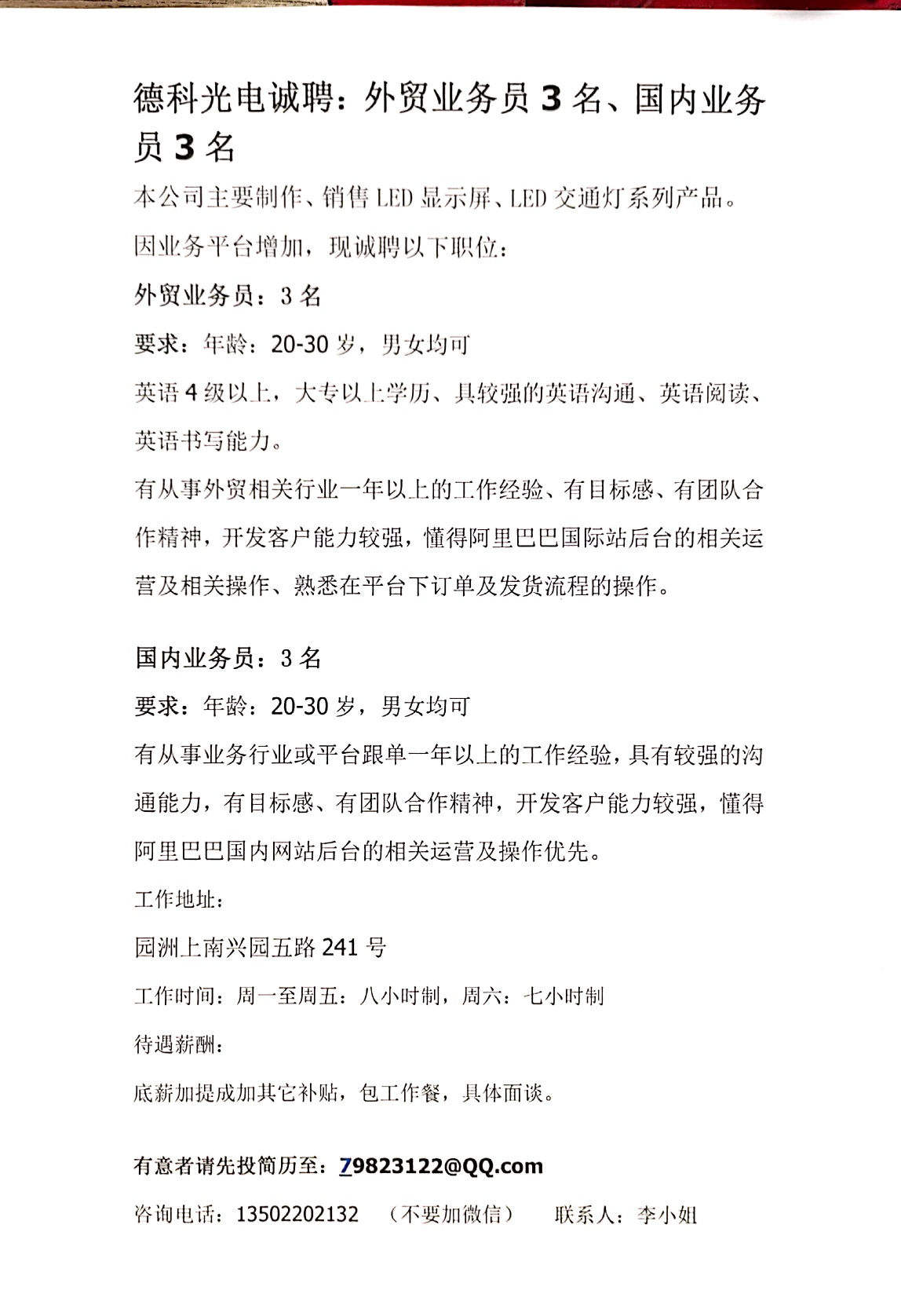 德科光电诚聘:国内业务员;国外业务员;