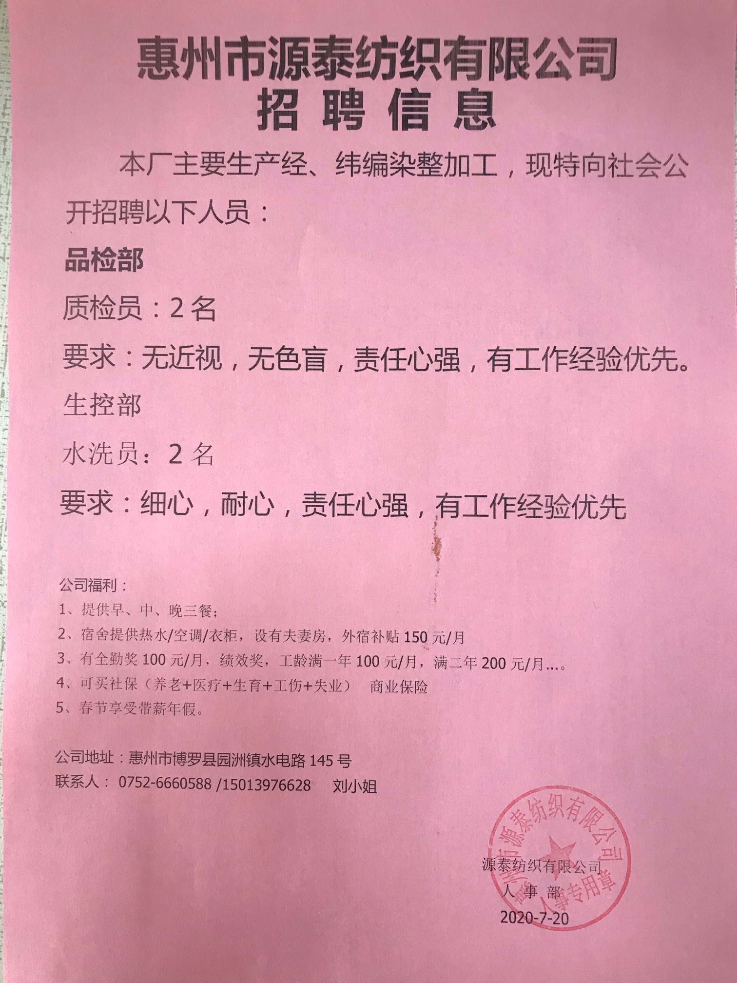 源泰纺织有限公司诚聘