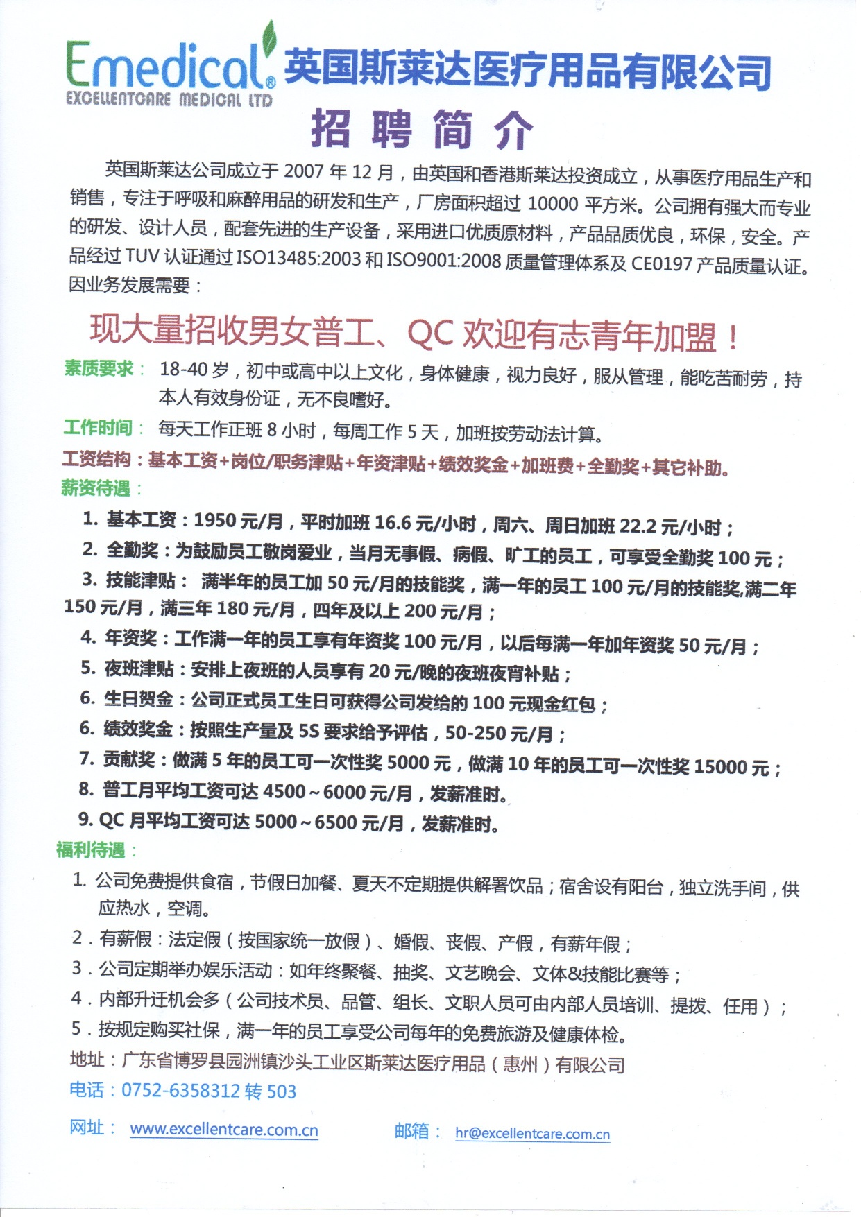 斯莱达大量招聘普工(4500--6000元/月)