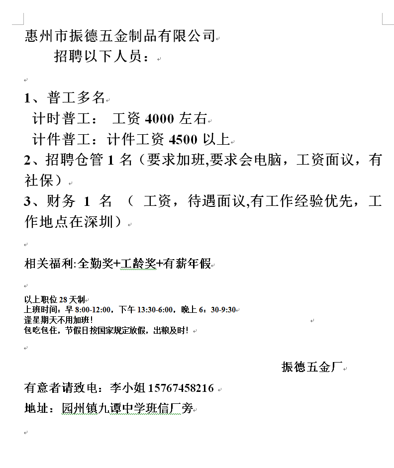 振德公司招聘普工。仓管。财务