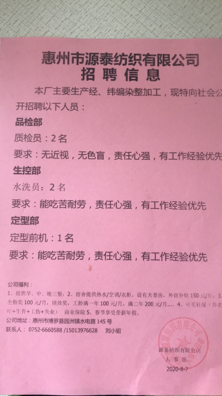 诚聘品管,水洗等职位