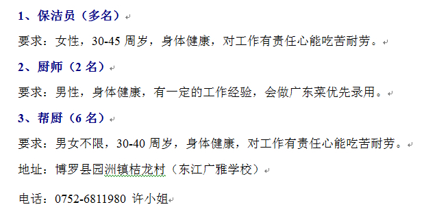东江广雅学校招聘保洁员、帮厨、厨师