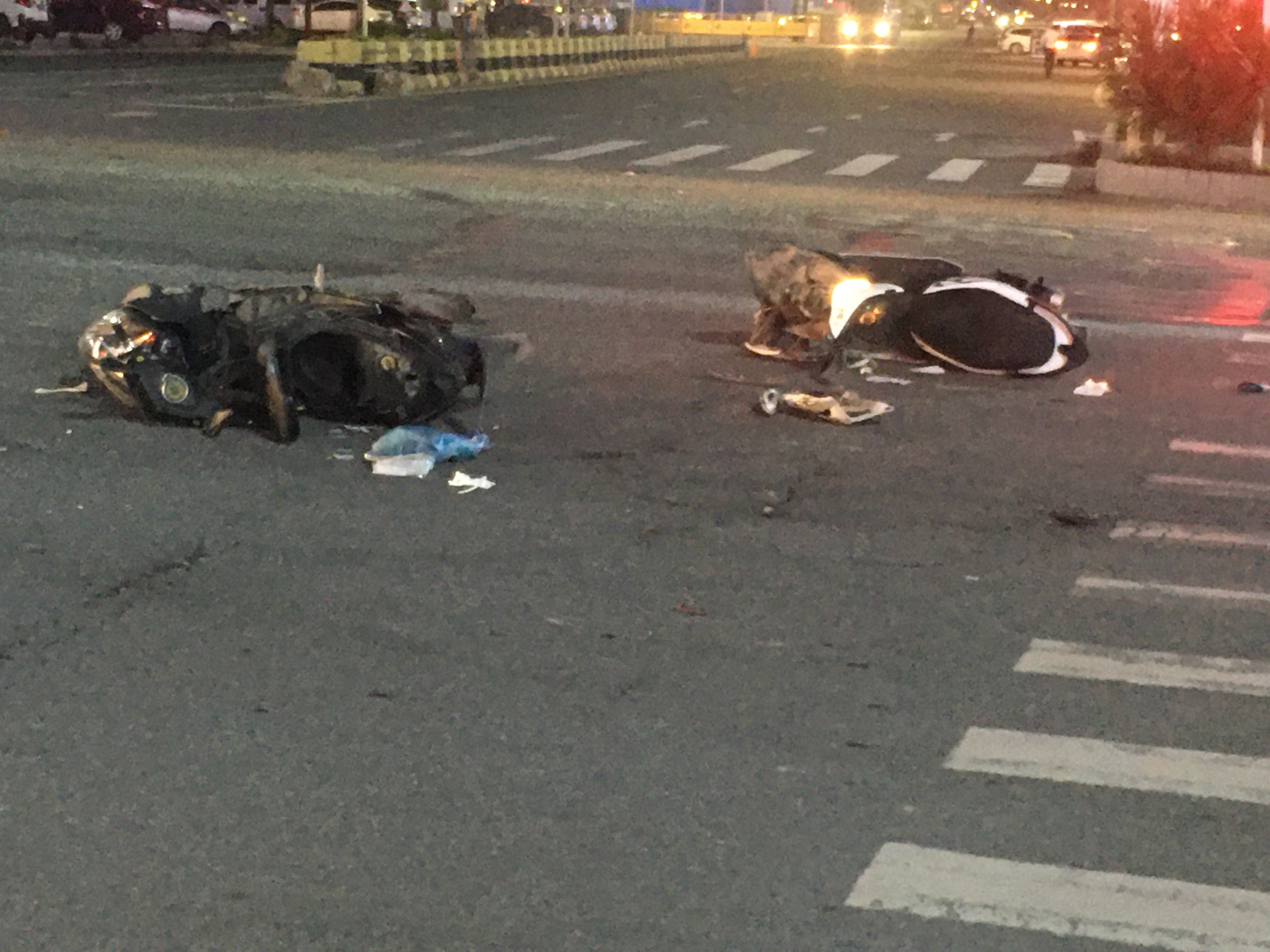丽枫洒店红绿灯路口两摩托相撞,4个重伤。