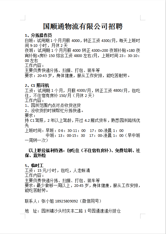 国顺通物流诚聘分拣操作员,C照司机,临时工多名。