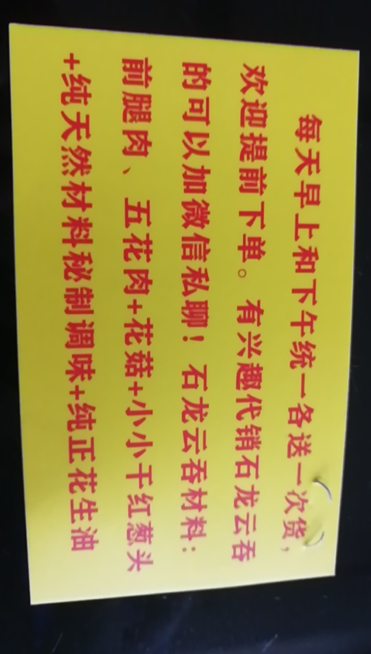 [勾引]每天早上和下午统一各送一次货,欢迎提前下单,有兴趣代销石龙云吞的18933251170可以私聊[勾引][勾引][勾引][呲牙]我店主打新鲜现包制巜石龙云吞》:材料每天新鲜挑选,猪肉用前腿肉,不加垃圾肉[呲牙]健康放心,红葱头增鲜,花菇切细调香,天然食材晒干磨粉作调味料,主要鲜甜味的精髓就在这[呲牙]不含味精和有害添加剂,采用纯正花生油,让云吞的味道更加鲜美,订购包送货哟[呲牙]营业中:新鲜现制《石龙云吞》(前腿肉+花菇+小小红葱头+纯天然秘制调味),生云吞26元/斤,云吞皮10元/斤,园洲可订购包送货上门哟[勾引][勾引][勾引]送货上门起订量1斤起