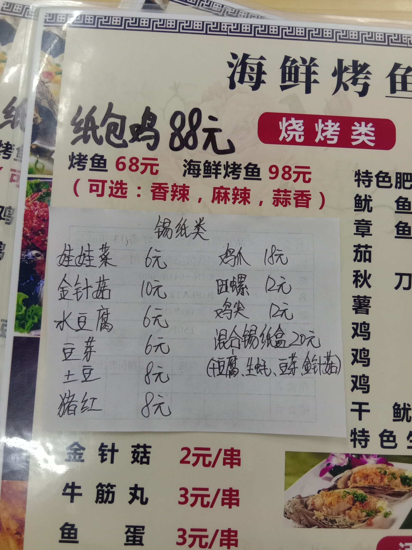 新推出纸包鸡,分享朋友圈集赞满28个,享受8折优惠,烤鱼买一送一,还有新品锡纸类,还有更多惊喜等着您!活动期间:10月11日至17日