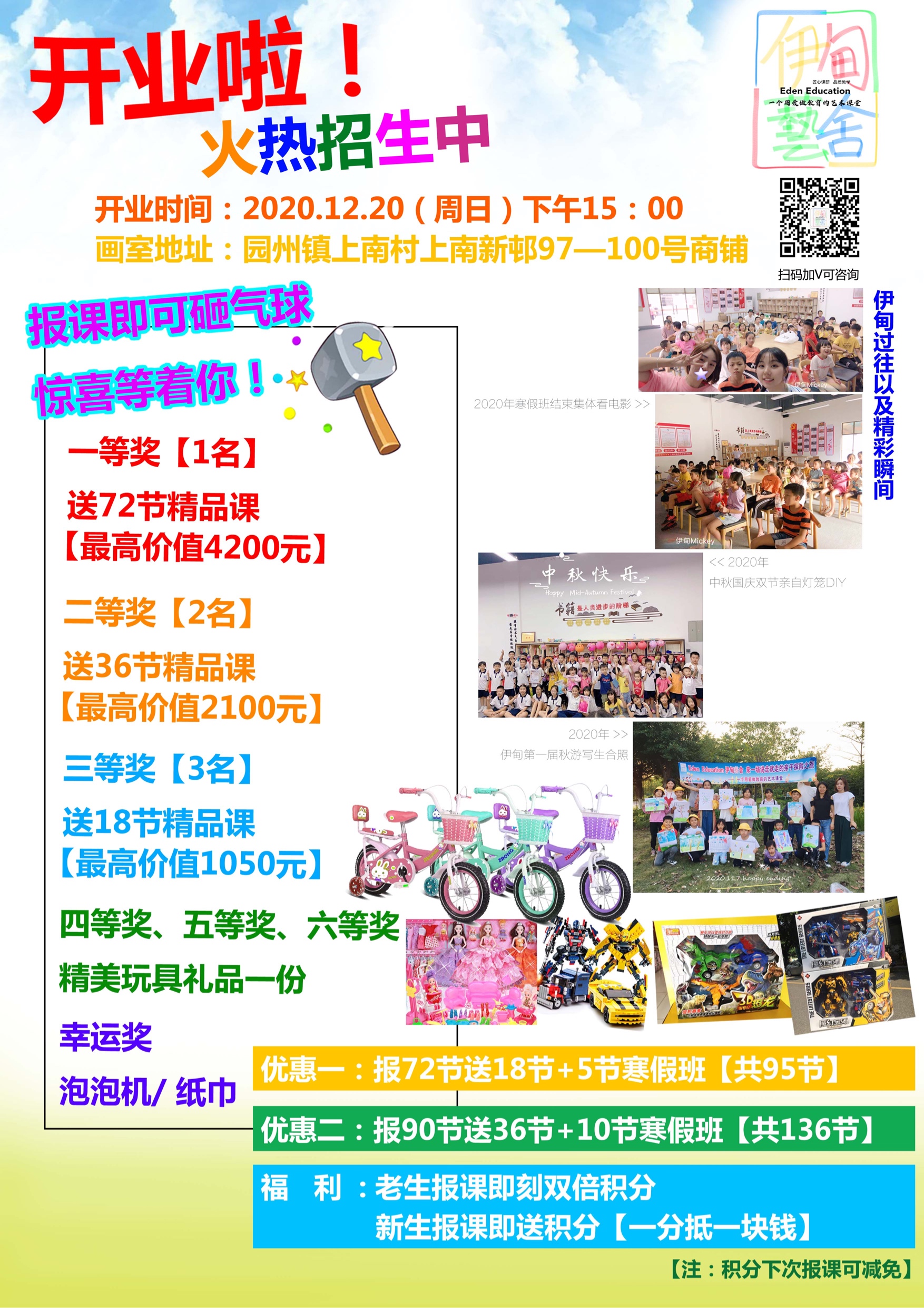 伊甸艺舍自2020年5月创办以来,秉承“一个用爱做教育的艺术课堂”的办学理念,为喜爱艺术的孩子打好基础。伊甸艺舍设有【3—4岁】小龄启蒙绘画班【5—6岁】启蒙绘画班,【7—9岁】思维绘画班,【9—11岁】漫画班,【11岁以上】素描班,【7岁以上】书法班,自己研发教材,系统规范的学习绘画和书法基础,培养孩子对艺术对生活的感受,让孩子的心灵与艺术相通,专注于孩童心理与绘画的联系,真正做到用爱做教学,伊甸艺舍专注于艺术素质教育、致力于培养懂艺术、会创作的孩子。“学美学的孩子懂得热爱生活”,在艺术的海洋里你将拥有更加精彩的童年和自信的人生!