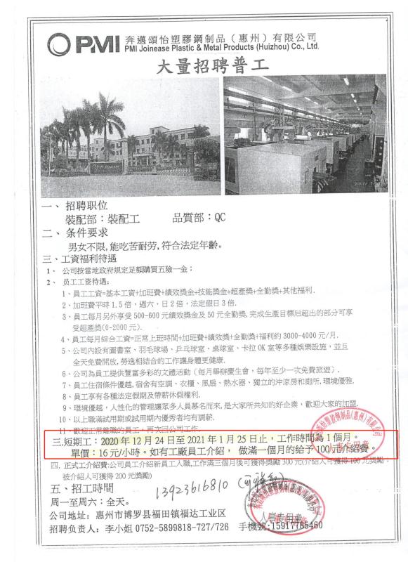招临时工,做到2021年1月25日止,16元/小时。