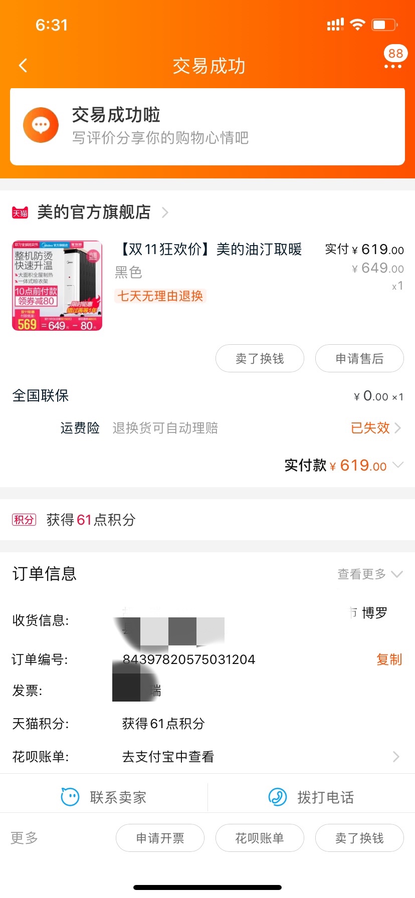 双十一买的,美的牌暖气,416元转让。【不议价】