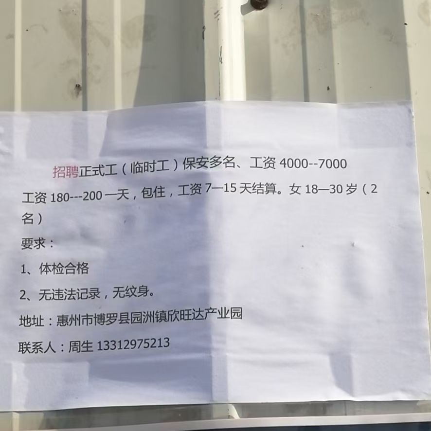 惠州欣旺达大量招聘男保安/女登记员!