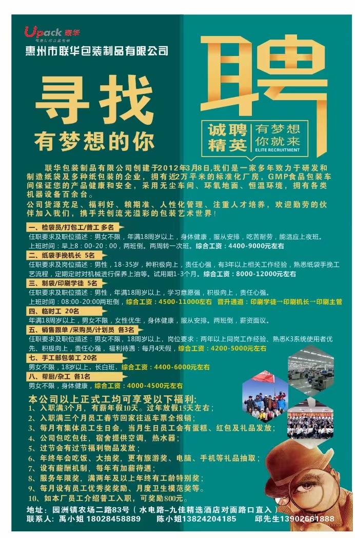 男女不限,能吃苦耐劳,需要上晚班,半个月转班一次,夜班补助20元一晚,工资结构:底薪加班费产量奖夜班补贴全勤奖金,月工资4500~10000万不封顶,做满一年有年限服务奖,年底车费报销,老员工介绍新员工1人得800元介绍费,地址:园洲镇农场二路83号,联系人朱小姐,联系方式19875243324