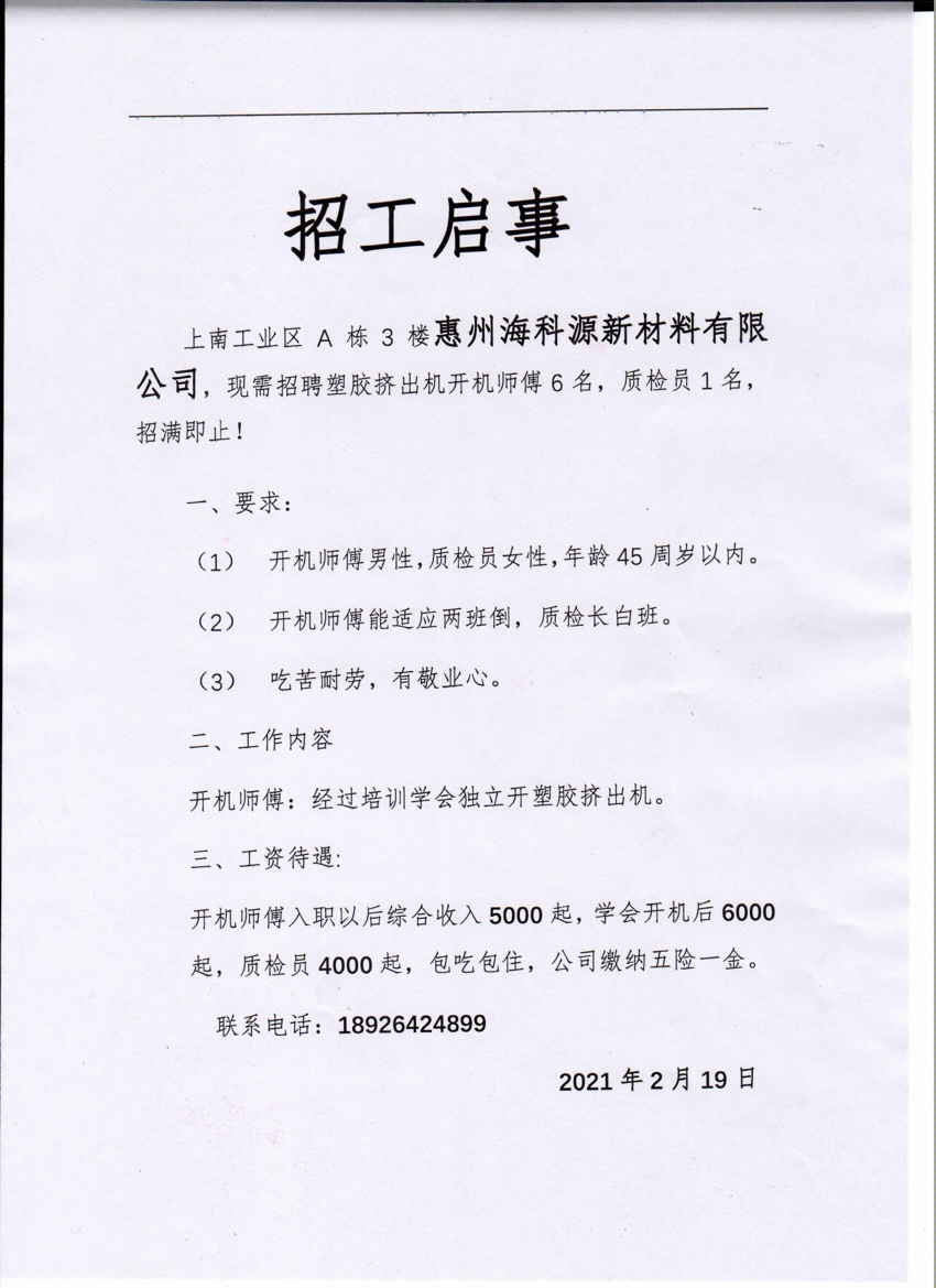 2021年海科源招聘啦!包吃住,五险一金,年终奖,福利好,还在找工作的赶紧加入我们大家庭吧!联系电话:18926424899