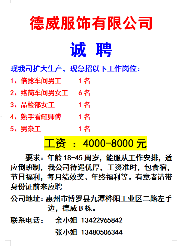 纺织厂诚聘