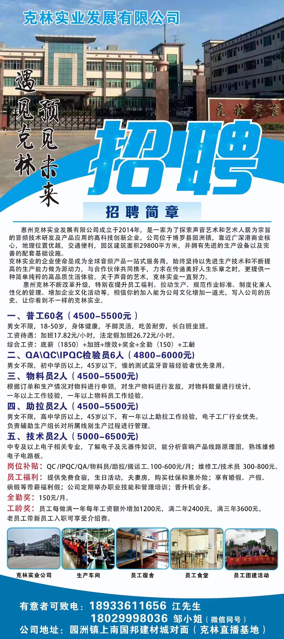 本公司主要生产音响喇叭。现招聘仓管员一名:要求男性。(工资45005500)有仓库管理经验者优先。上班时间早上8:00-12:00 下午13:30-17:30 逢星期天休息,包吃包住 ,入职后可购买社保。
