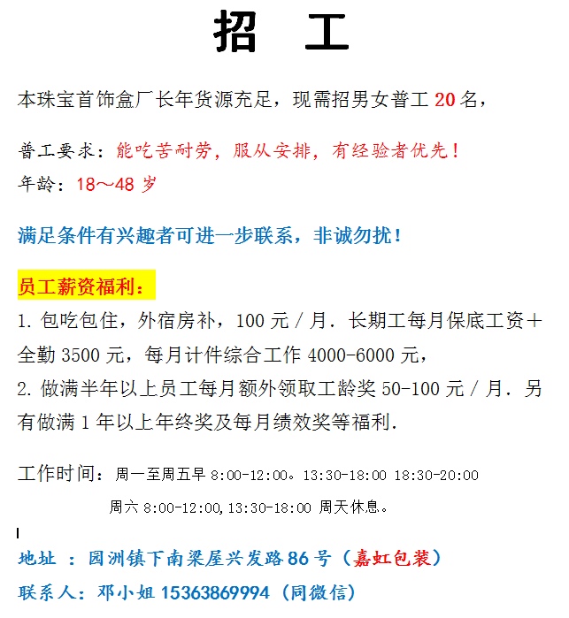 首饰盒招男女普工