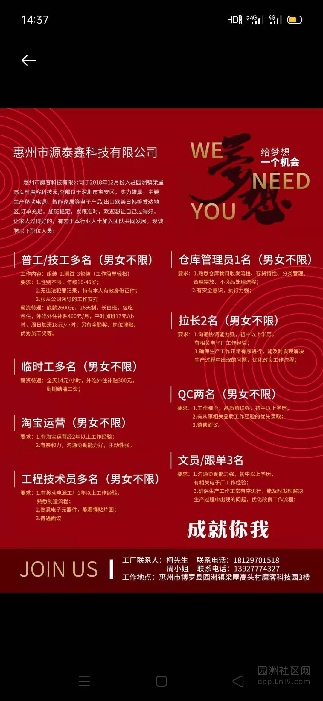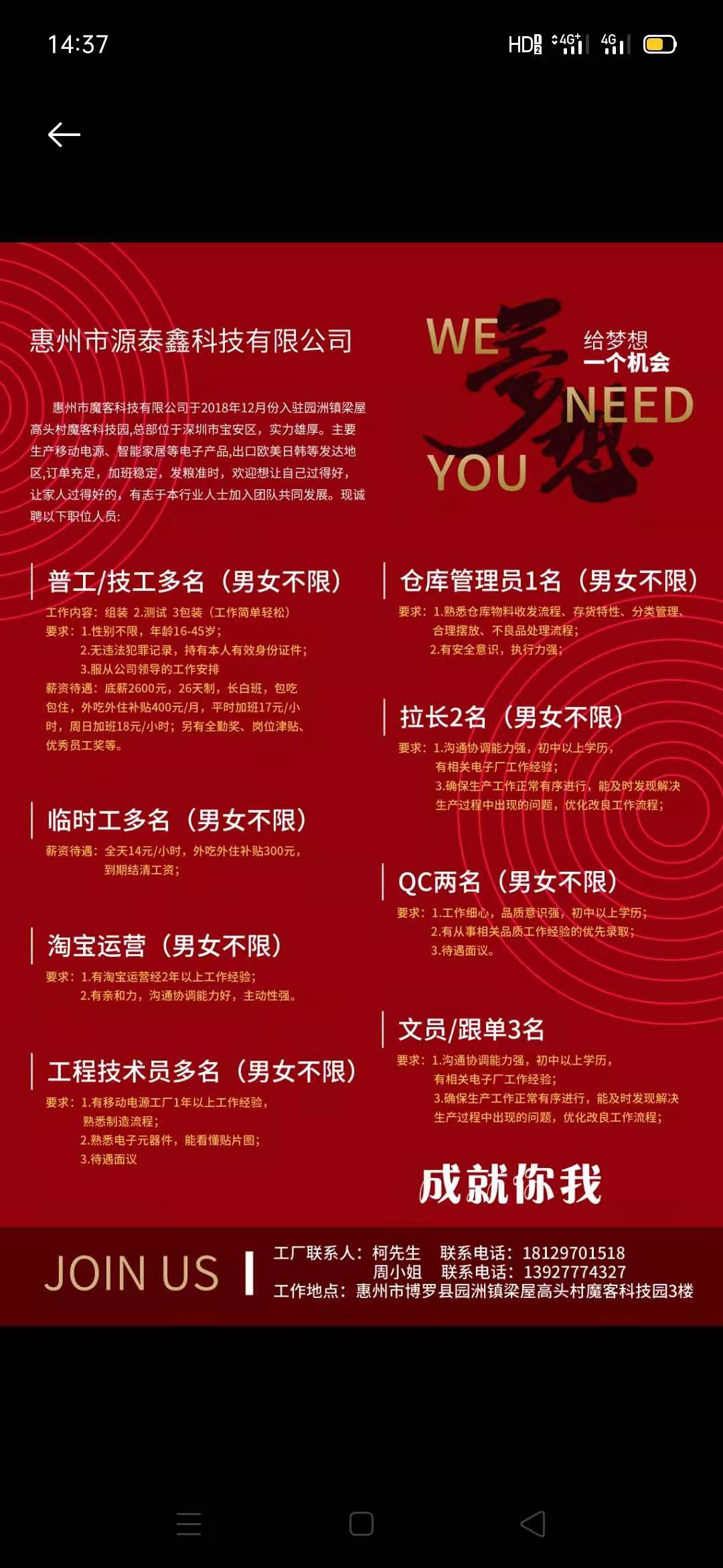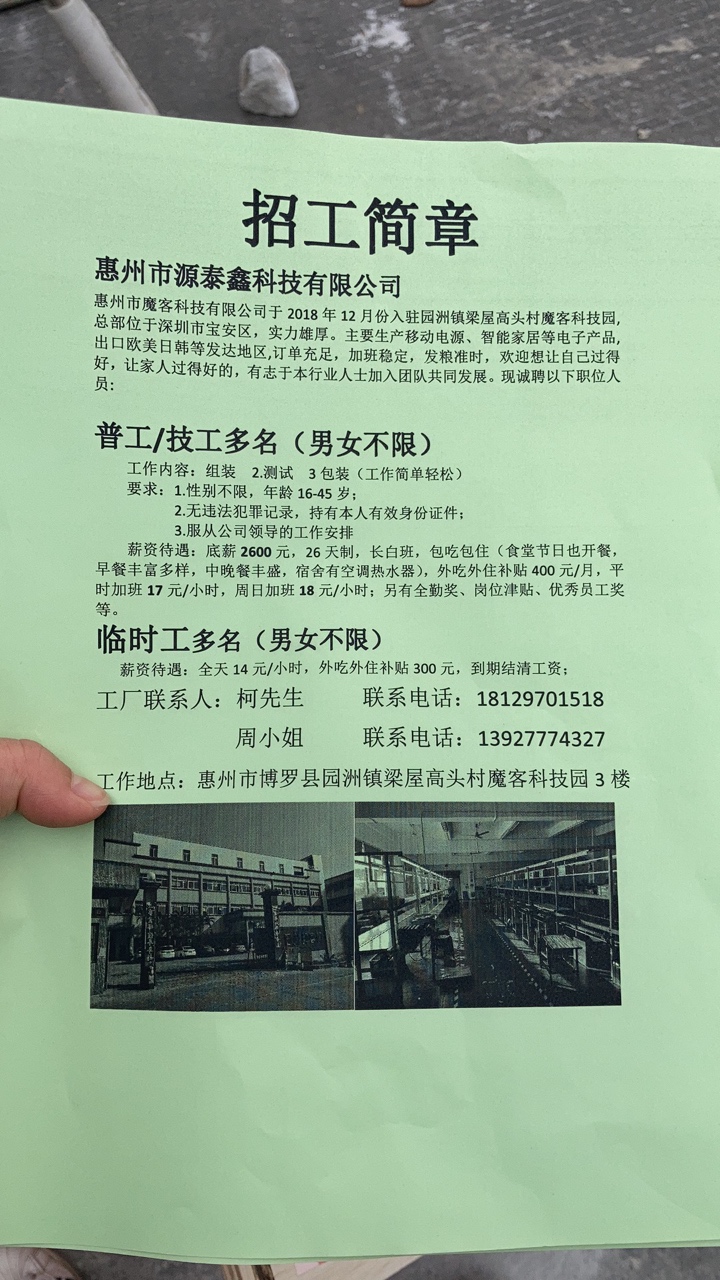 工作地点:惠州市博罗县园洲镇梁屋高头村魔客科技园3楼