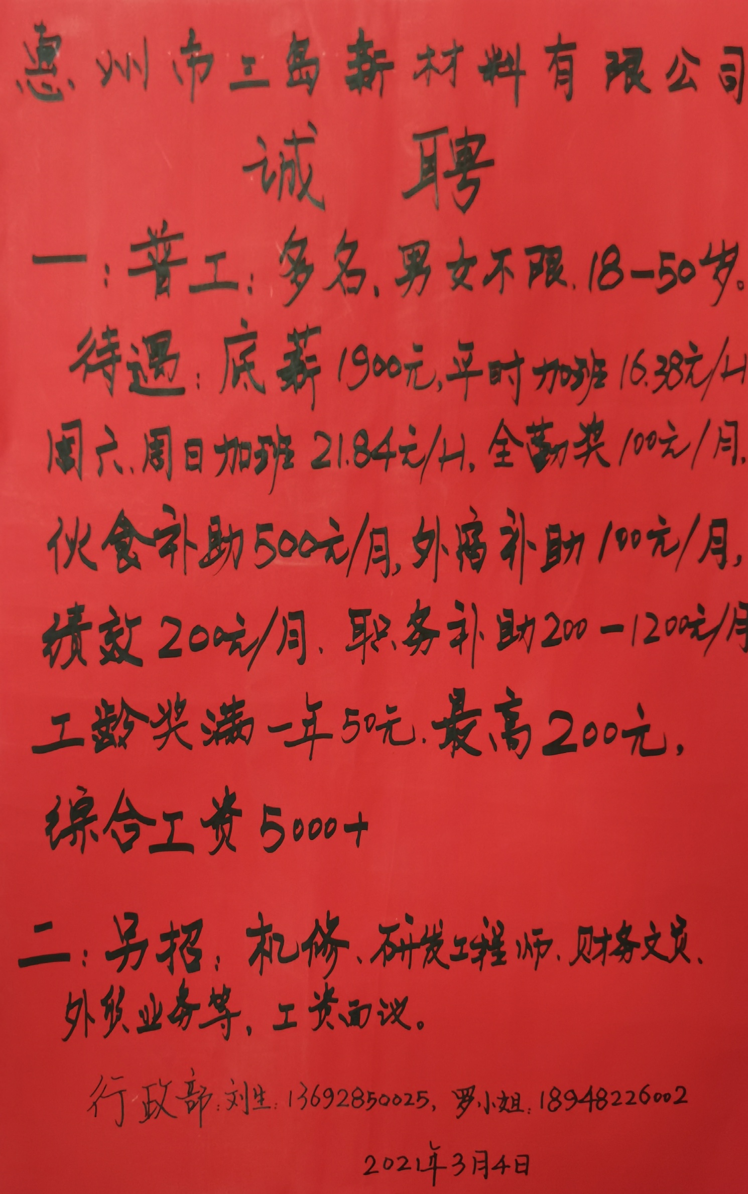 工厂诚聘普工多名