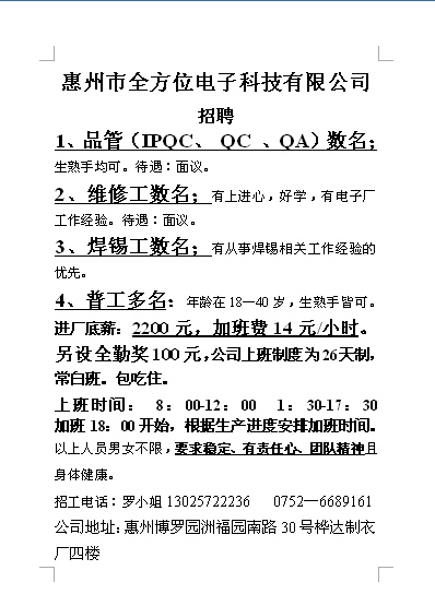 招采购、品管、普工多名