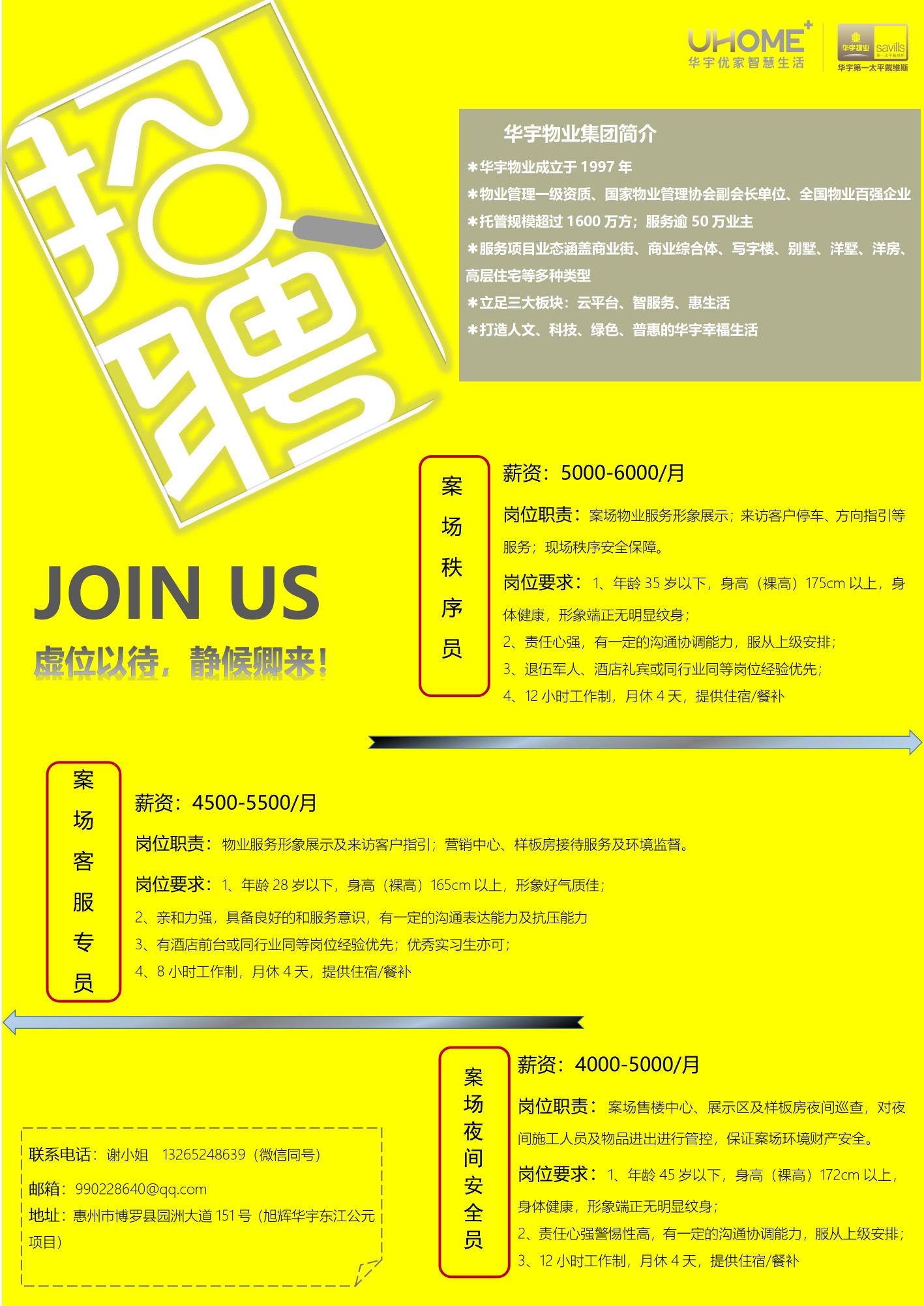 华宇第一太平戴维斯物业管理有限公司,现急聘售楼中心白班/夜班保安、客服接待员、保洁员多名,主要负责售楼处来访客户接待服务、安全秩序维护及环境卫生保障,为客户提供优质的看楼体验。公司有良好的企业文化氛围,完善的管理制度和完整的人才培养体系,福利待遇高于本地多数同行,期待你的加入!