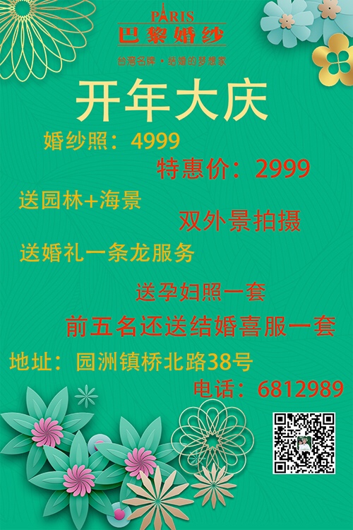 巴黎婚纱开年大庆.原价4999.特惠价2999.送双外景拍摄.园林十海景.再送婚礼一条龙服务.再送孕妇照一套.前5名送结婚喜服一套.[玫瑰][玫瑰][勾引][勾引].幸福热线13580818862