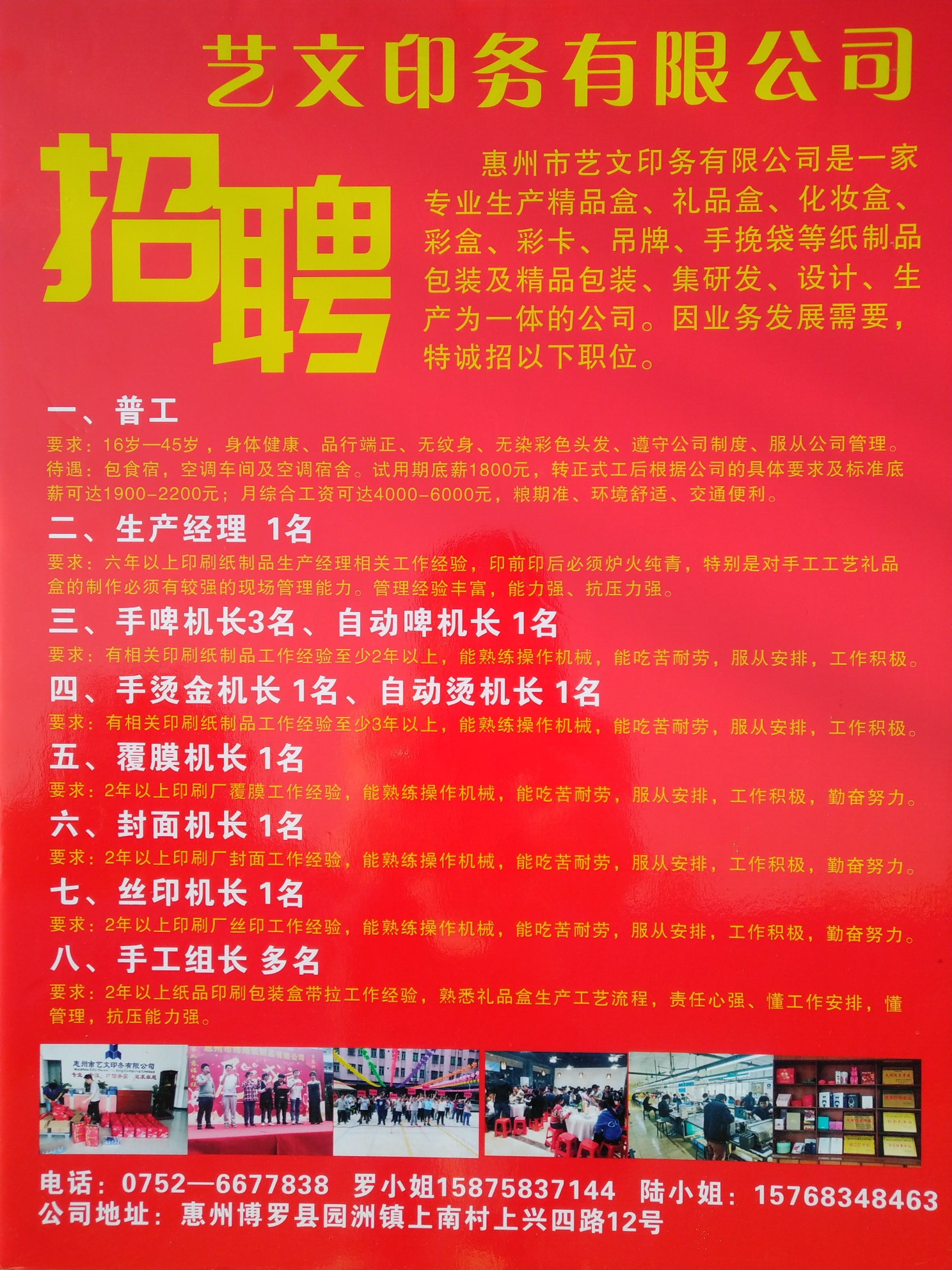 惠州市艺文印务有限公司专业生产精品盒、礼品盒、化妆盒等纸制品包装及精品包装,因业务发展需要,特诚招以下职位。