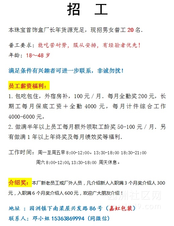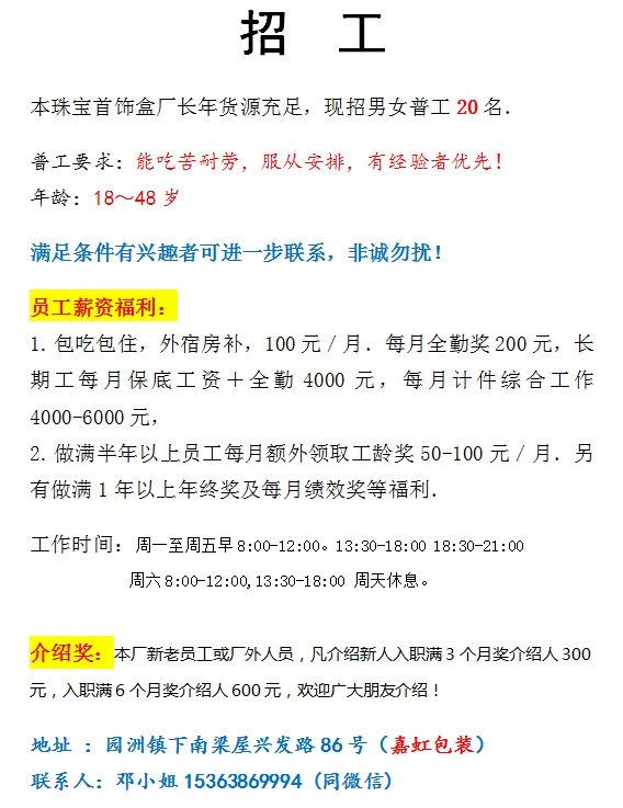 本工厂专业生产珠宝盒,现招正式普工多名,有工作经验者优先,具体工作时间和待遇如图!