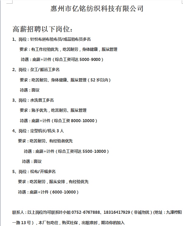 亿铭纺织高薪招聘