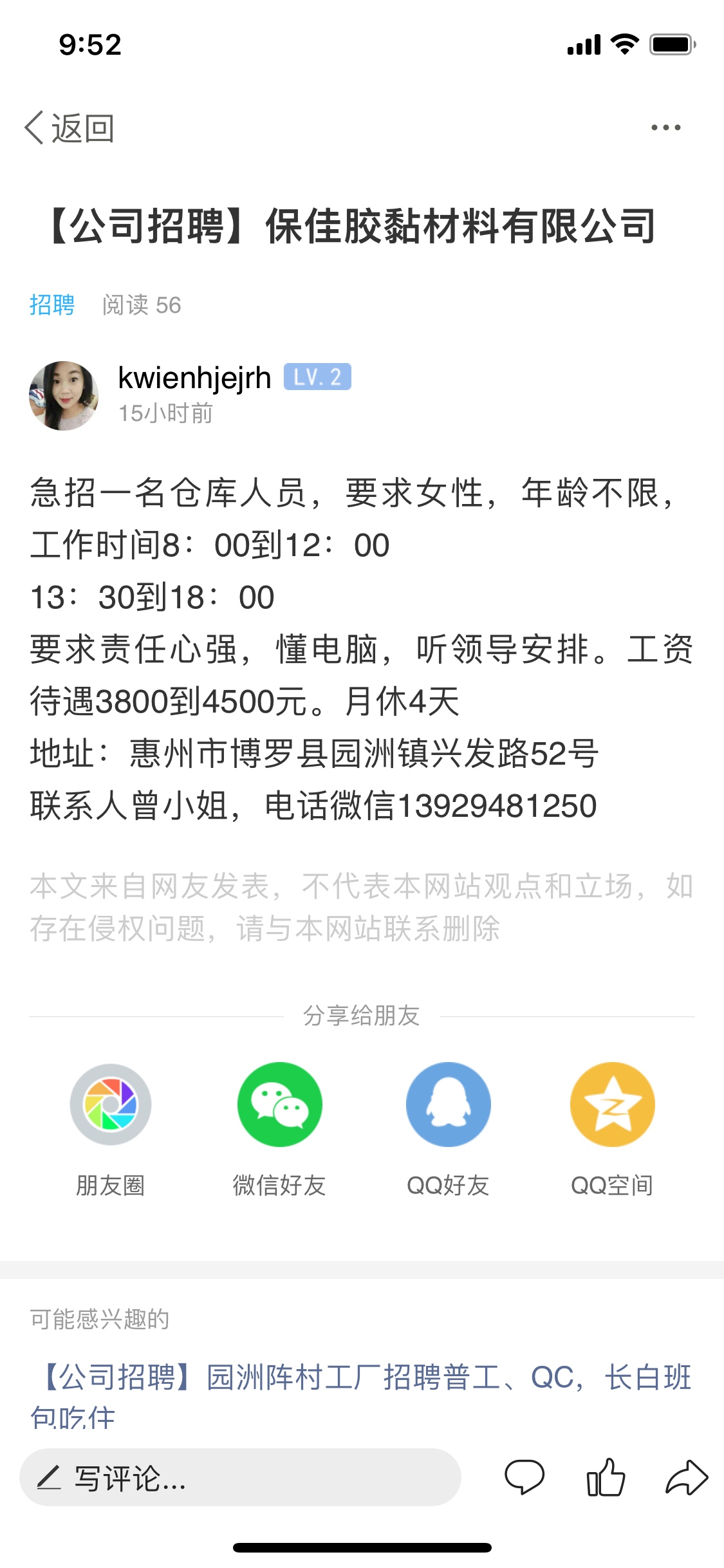 急招一名仓库人员,要求女性,年龄不限,工作时间8:00到12:00