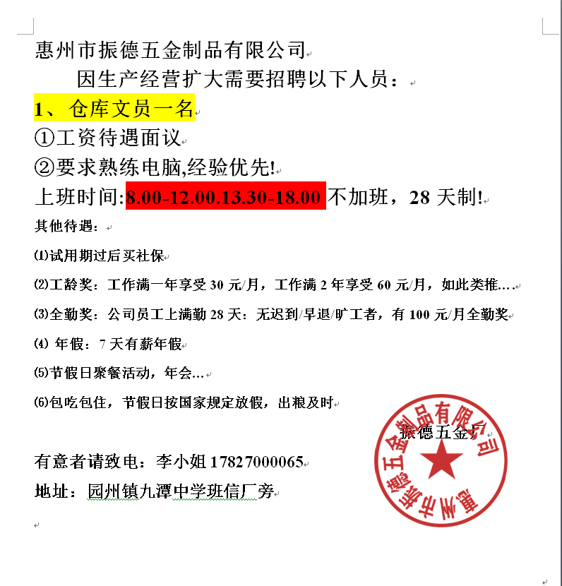 招聘文员(不加班),普工多名,临时工多名!
