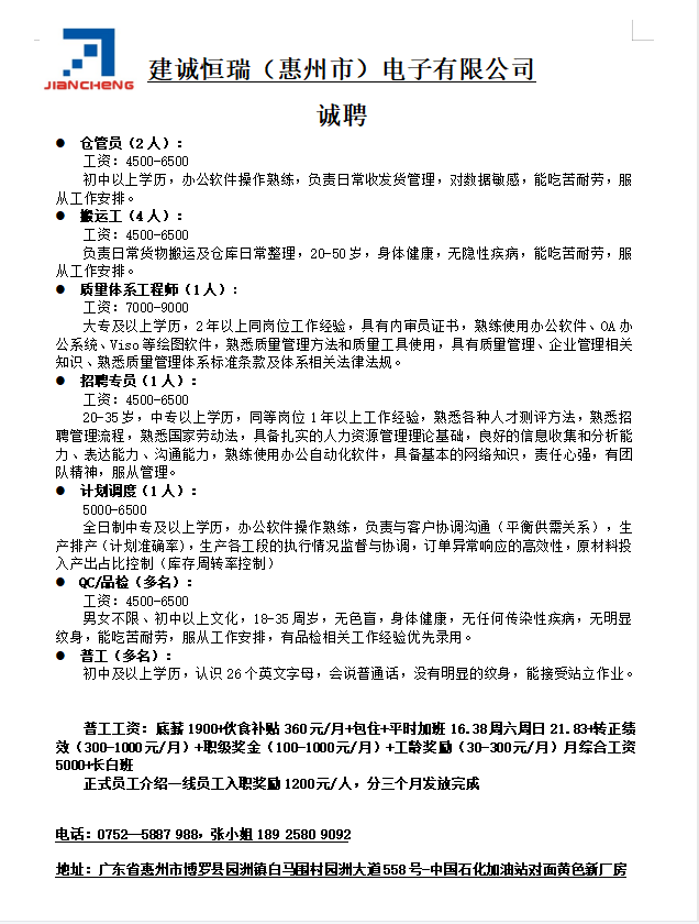 建诚恒瑞(惠州市)电子有限公司诚聘