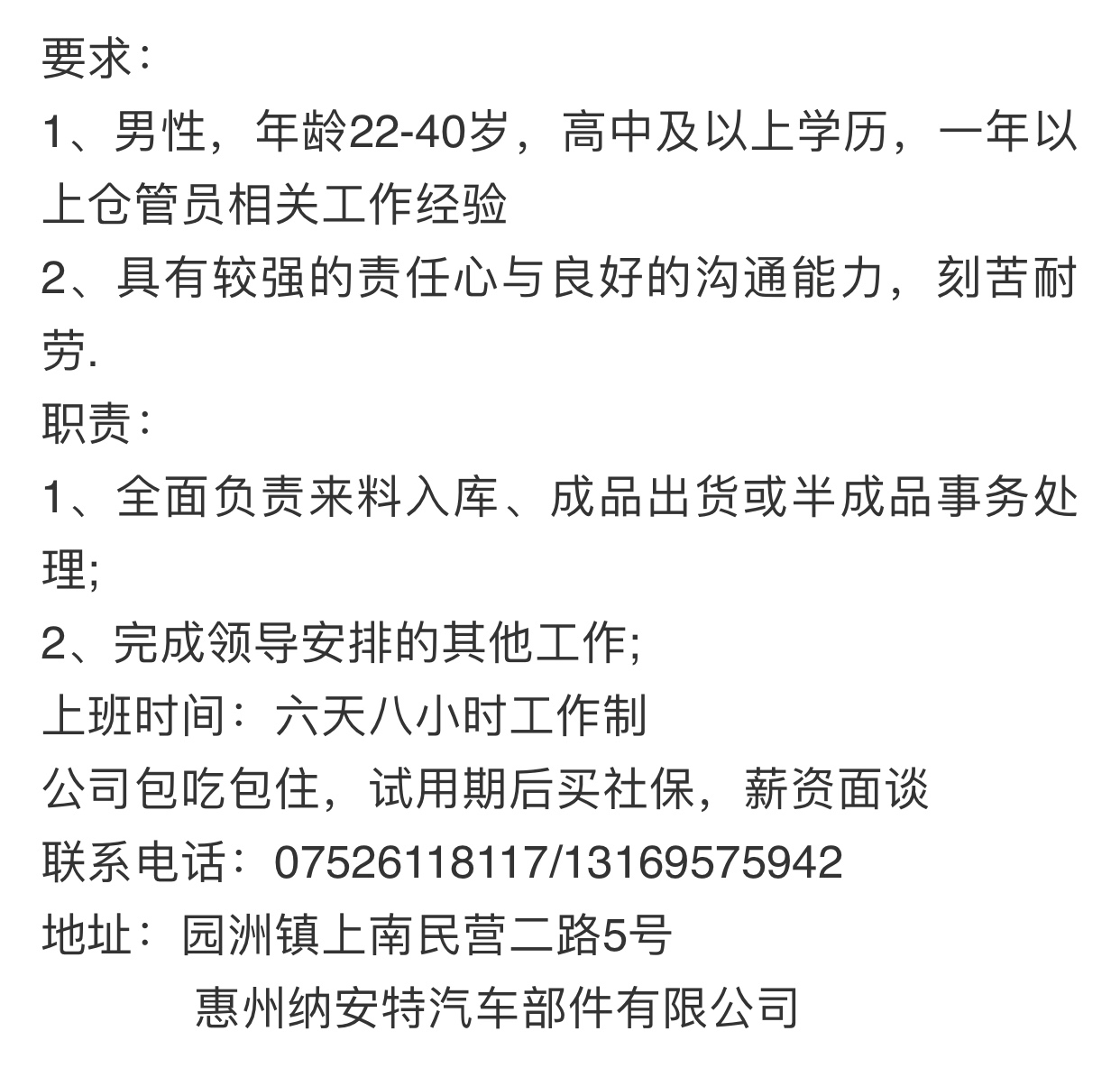 急聘 仓管一名