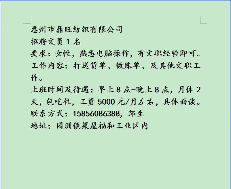 鼎旺纺织有限公司招聘文员