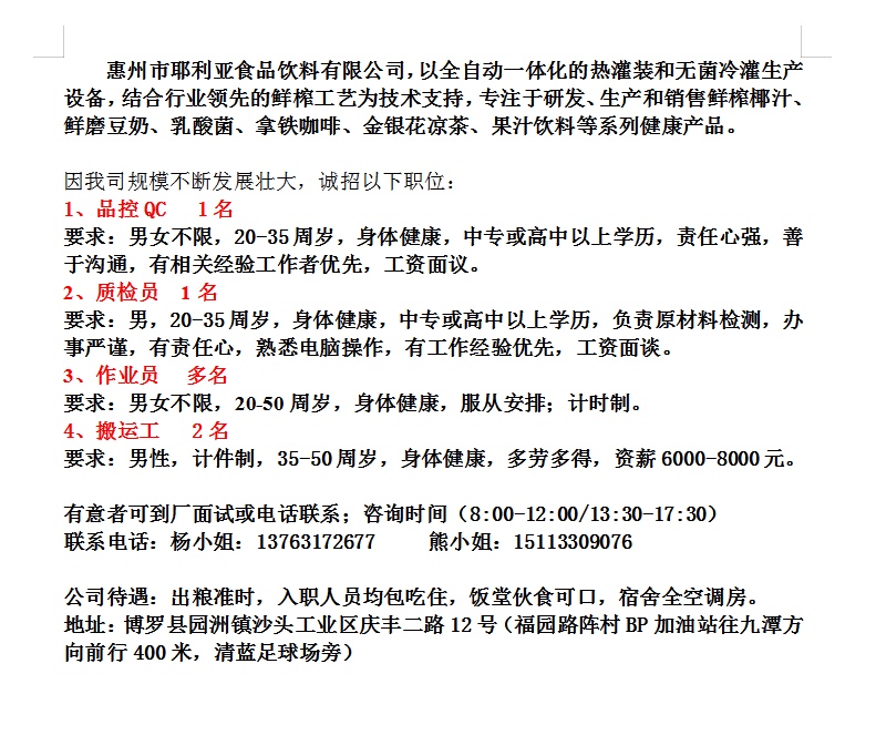 公司待遇:出粮准时,入职人员均包吃住,饭堂伙食可口,宿舍全空调房。地址:博罗县园洲镇沙头工业区庆丰二路12号(福园路阵村BP加油站往九潭方向前行400米,清蓝足球场旁)